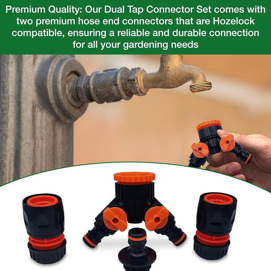 Dual Tap Connector Set - Two Premium Hose End Connectors with 3rd Male Tap Connector Included for Inline Use - Hozelock Compatible for Gardening, Watering, and Irrigation Needs.