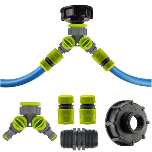 IBC 2” S60X6 Cap with Two Way Valved Splitter and Hose Connectors and PTFE Tape Durable Leak-Proof Kit