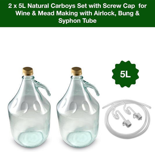 Glass Demijohn Set with Screw Cap - 2 x 5L Natural Carboys for Wine & Mead Making Kit with Airlock, Bung - Complete Demijohns Wine Making Kit