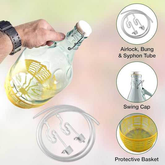 Glass Demijohn Set with Swing Cap & Protective Basket - 2 x 5L Natural Carboys for Wine & Mead Making with Airlock, Bung - Complete Demijohns Wine Making Kit, Including Syphon Tube.