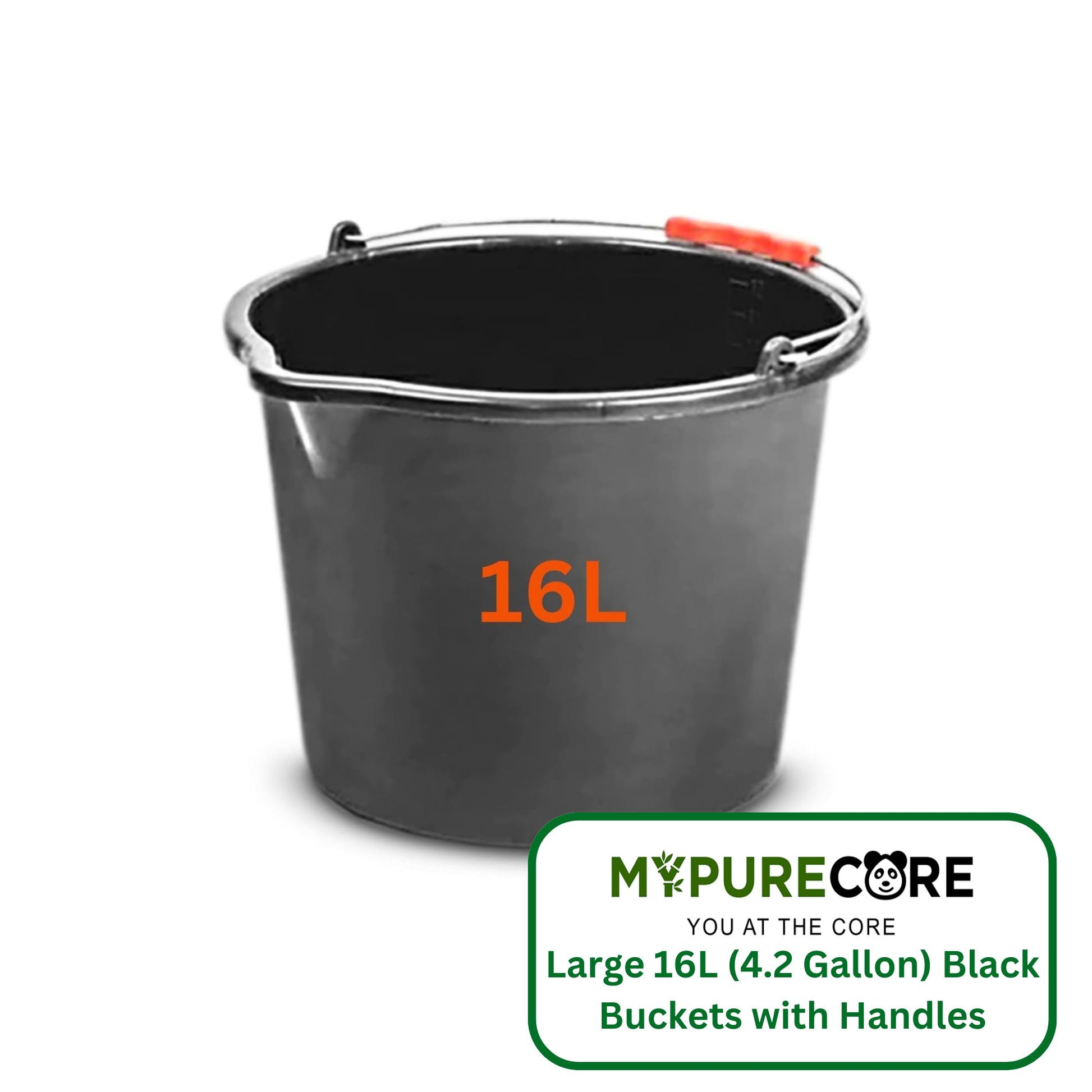 Large 16L (4.2 Gallon) Black Plastic Buckets with Handles - Sturdy Multipurpose Containers with Measuring Scale