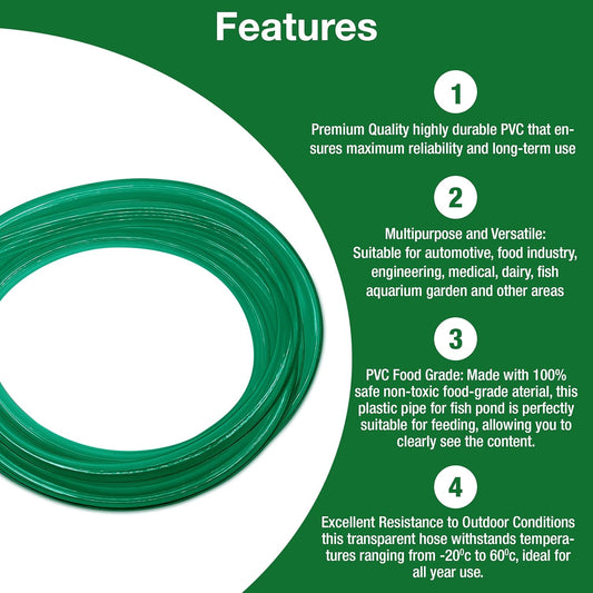 Flexible Hose Pipe 16mm Inside Diameter 20mm Outside Diameter – 4 Metres Clear PVC Food Grade Green Plastic Tube for Fish Food, Engineering, Food Industry