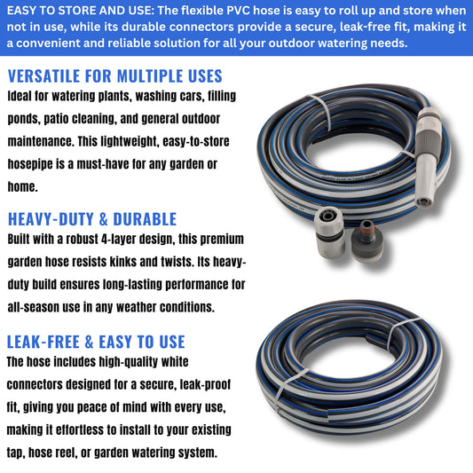 Garden Hose – 4-Layer Flexible Hose Pipe with 2 Universal Hose Connectors – Kink-Resistant, UV-Protected, Durable PVC Watering Hose for Garden, Car Wash & Outdoor Use