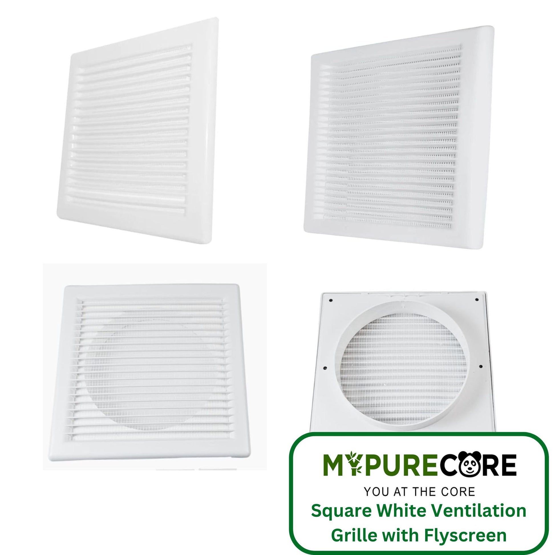 Square White Ventilation Grille with Flyscreen - Round Ø 100mm – 4 inch Rear Spigot