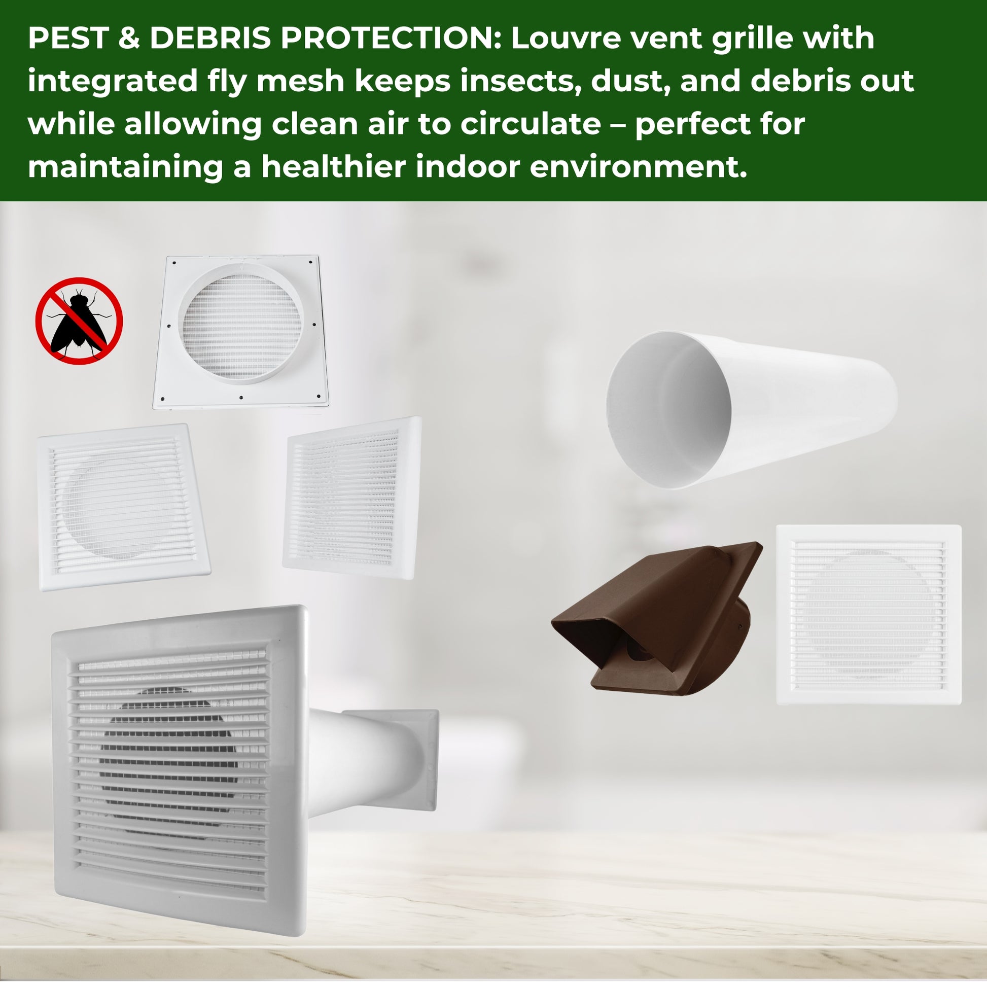 ★ PEST & DEBRIS PROTECTION: Louvre vent grille with integrated fly mesh keeps insects, dust, and debris out while allowing clean air to circulate – perfect for maintaining a healthier indoor environment.