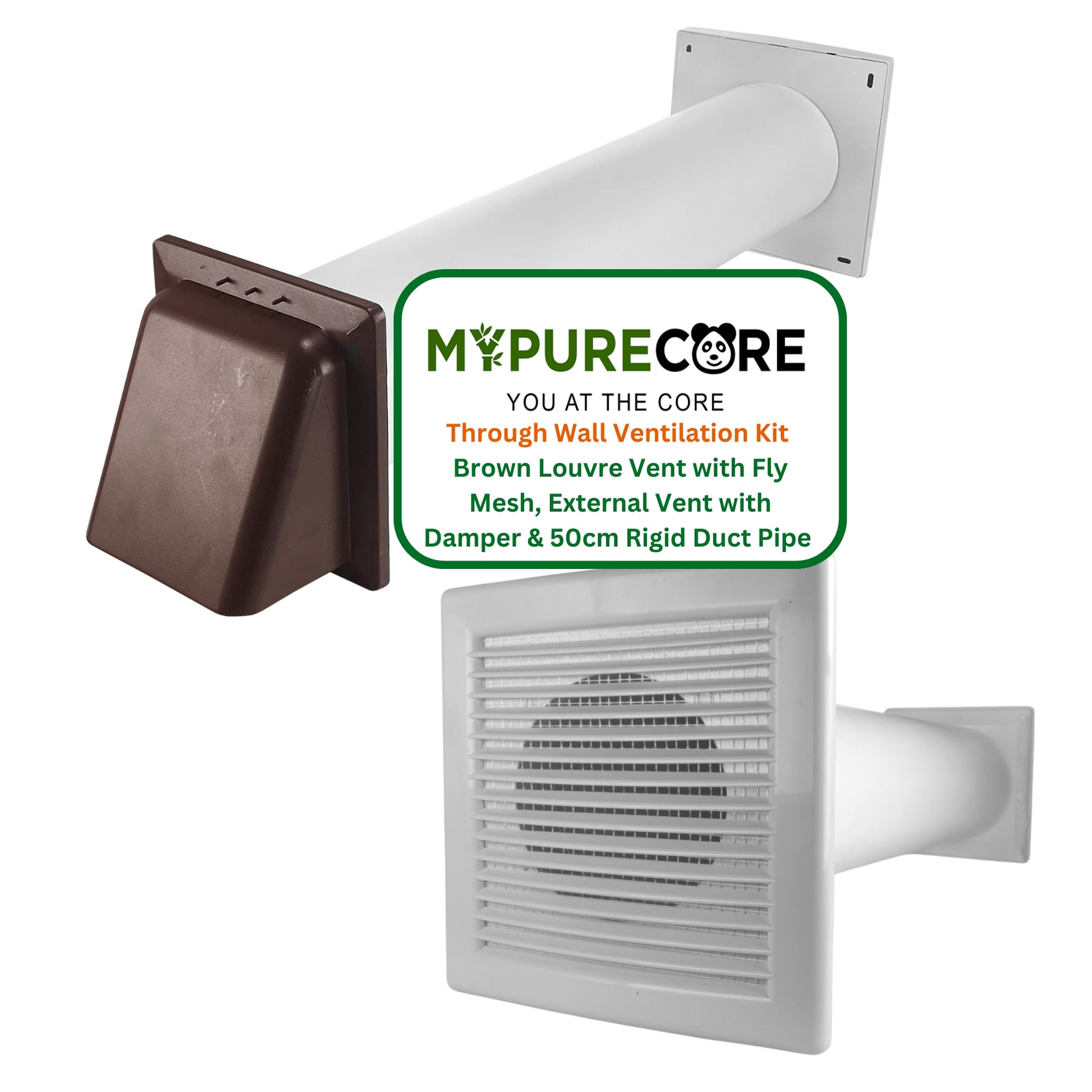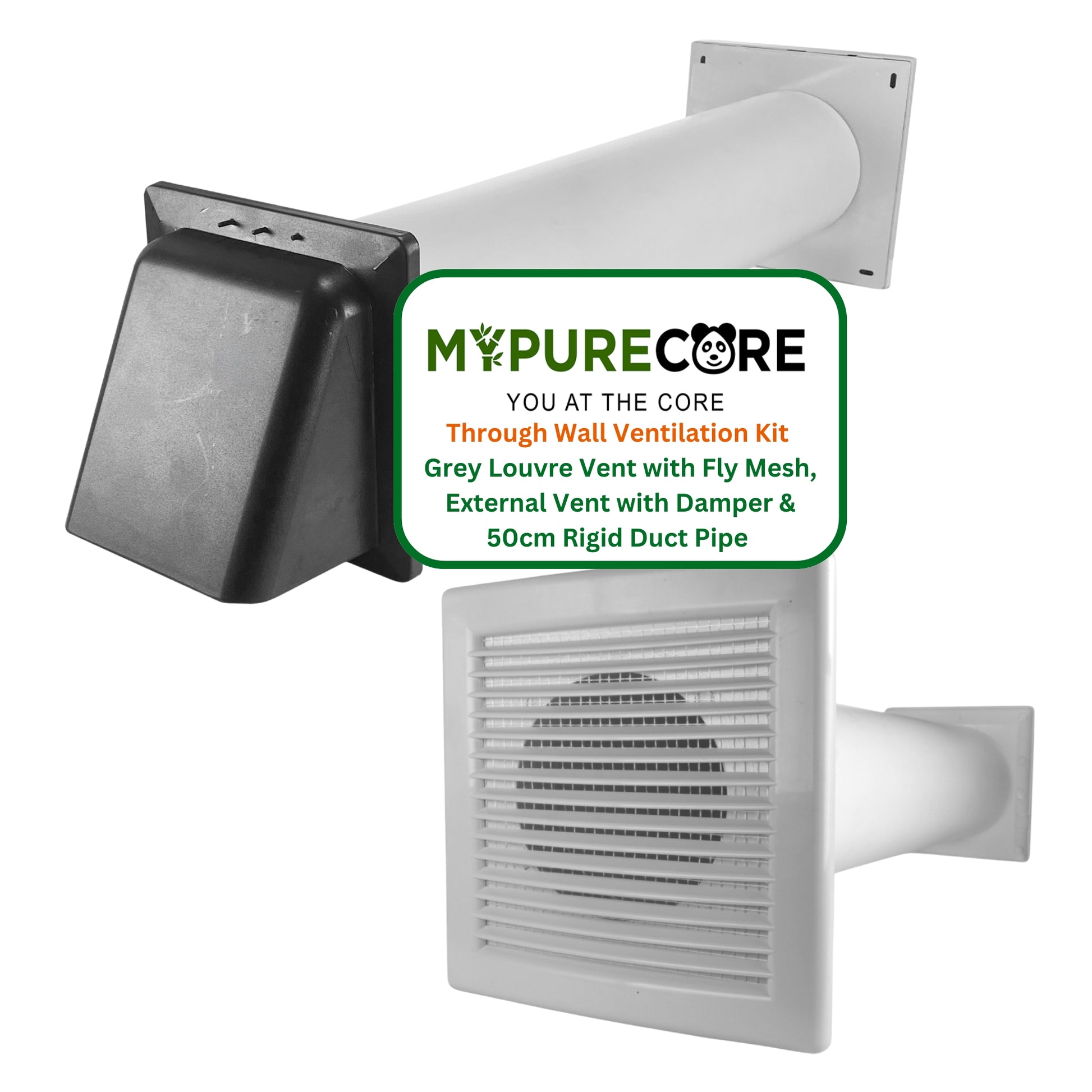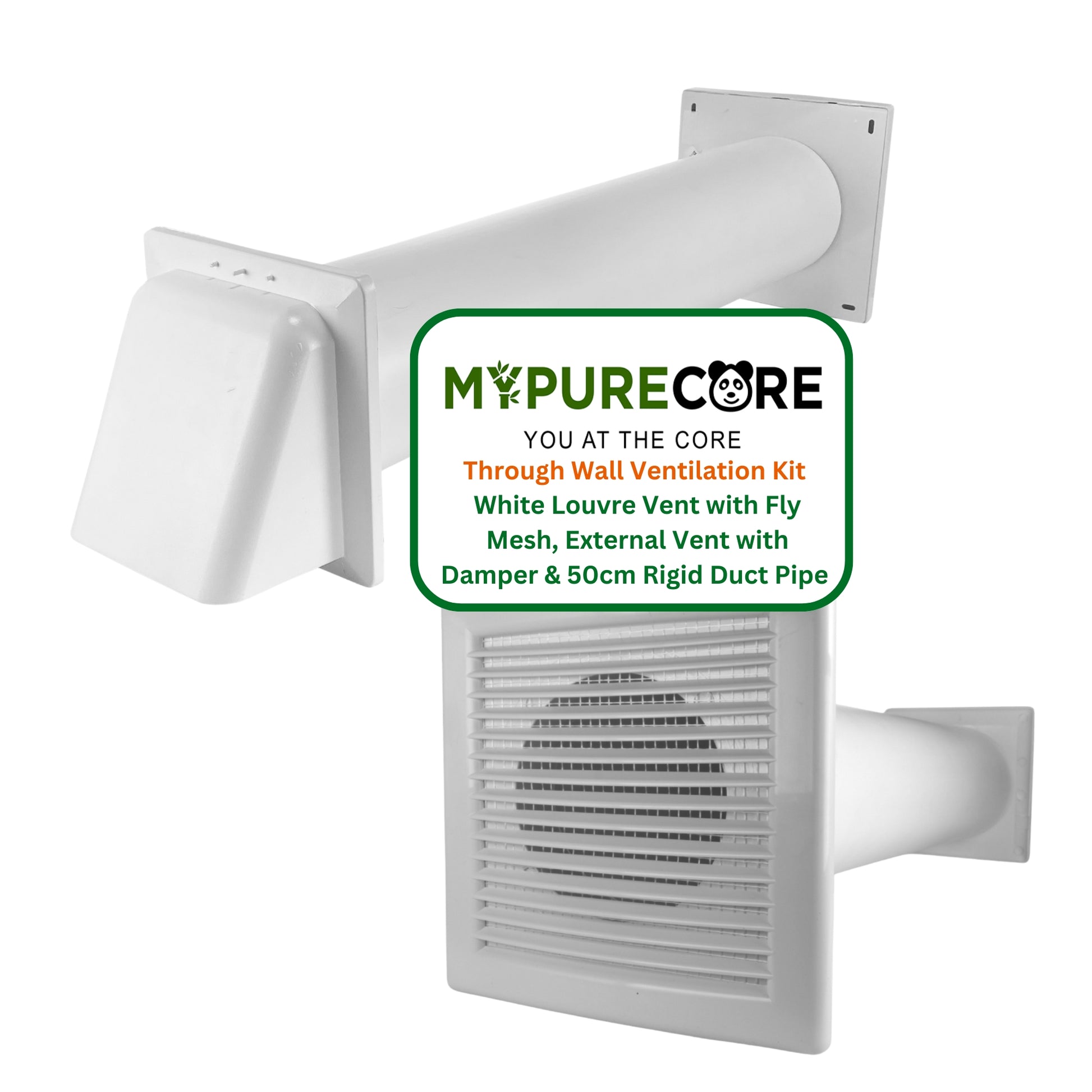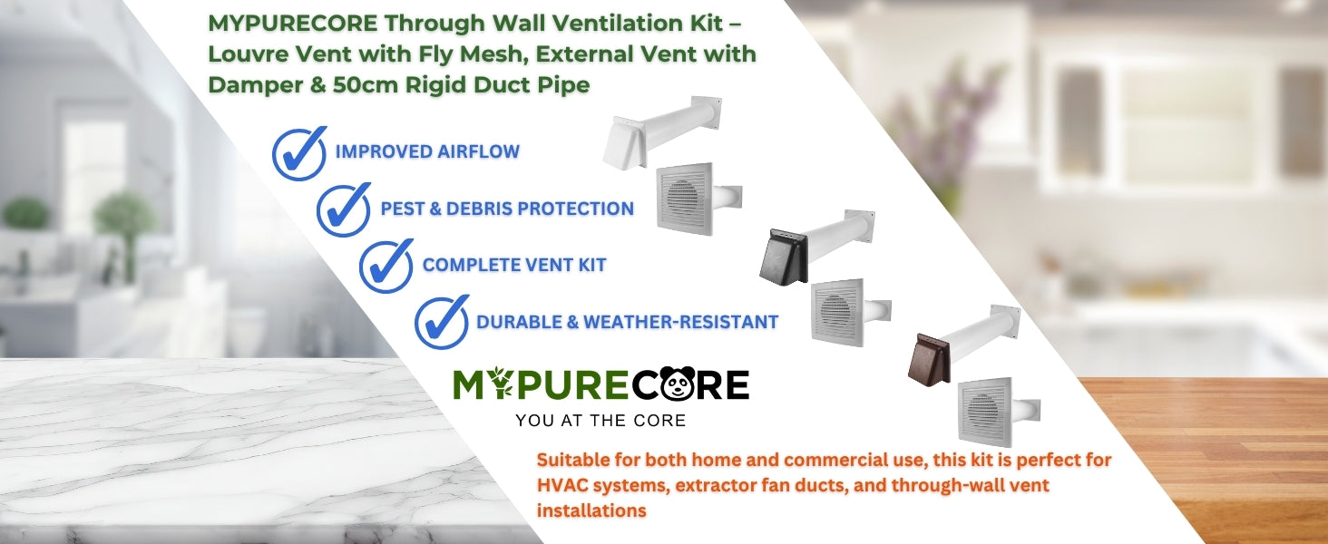 Improve airflow and protect your home with the MYPURECORE Through Wall Ventilation Kit – the all-in-one solution for effective indoor ventilation. This complete wall-mounted kit includes a White Louvre Vent Grille with Fly Mesh, a 50cm Rigid PVC Duct Pipe, and External Hooded Vent with Damper, designed to enhance air circulation while keeping unwanted pests and debris outside.