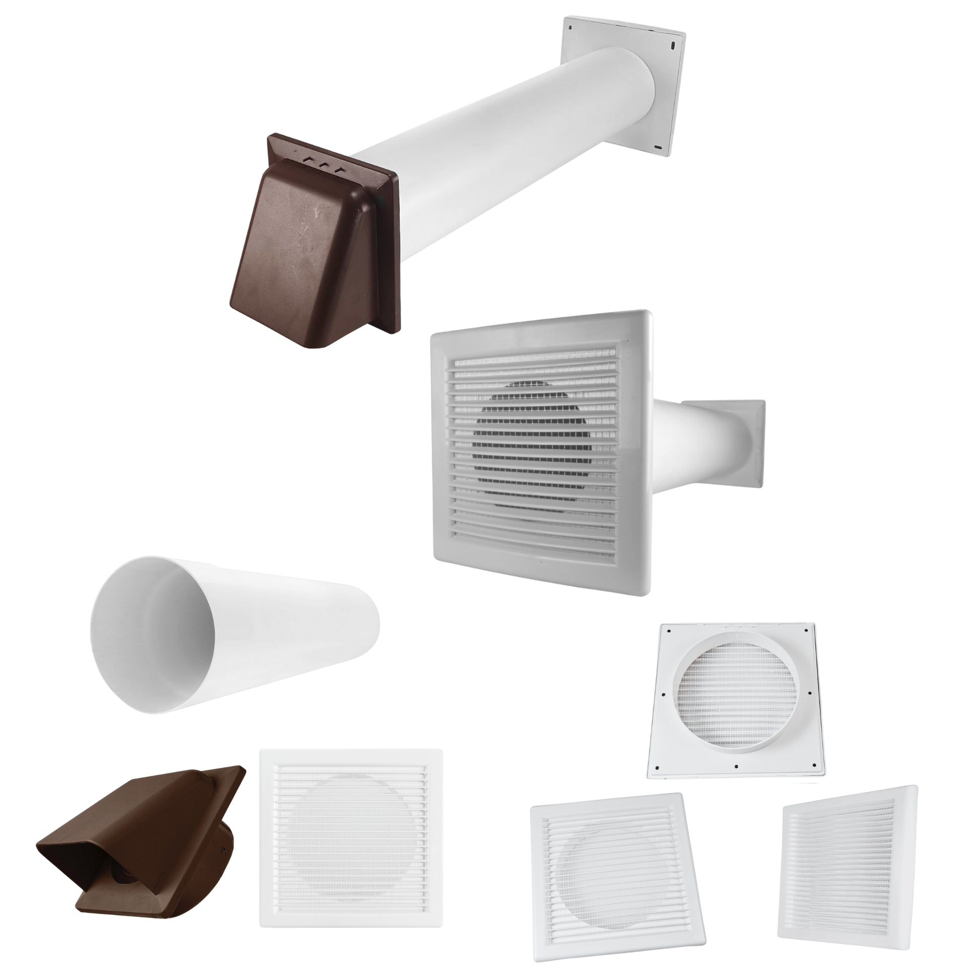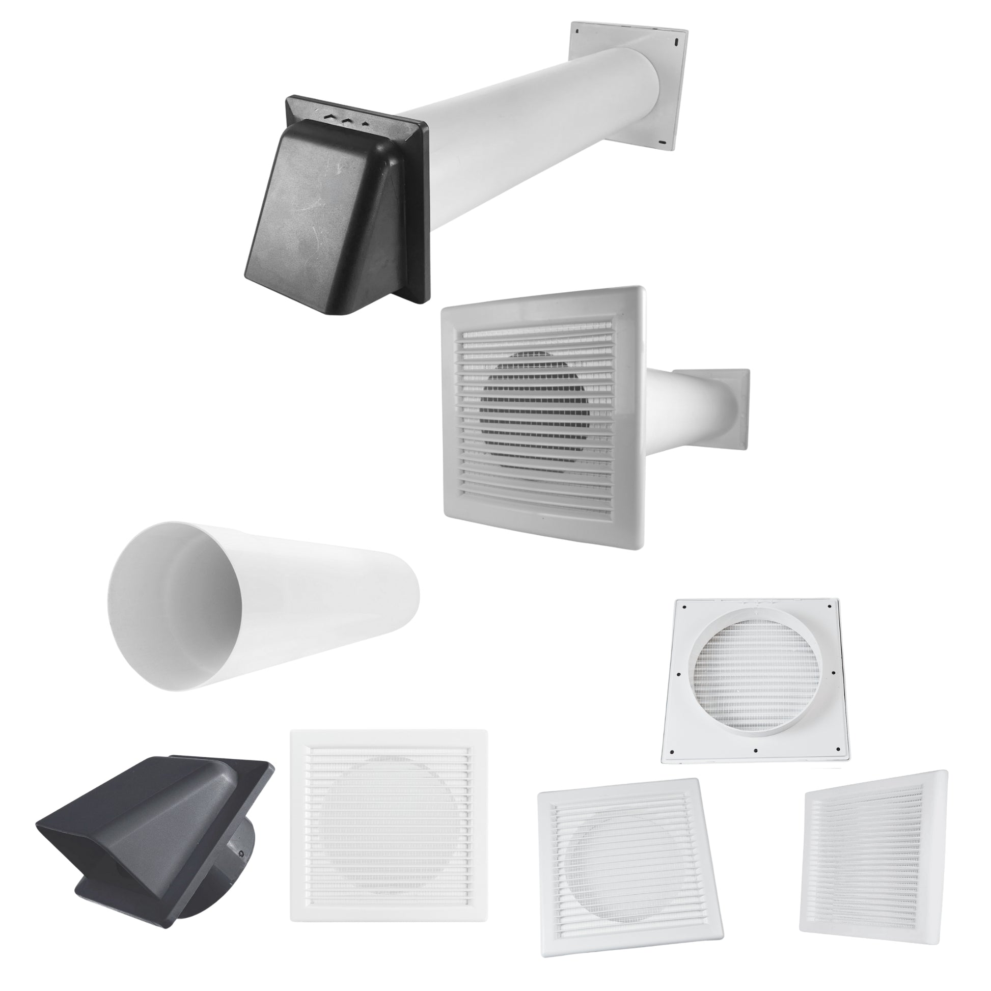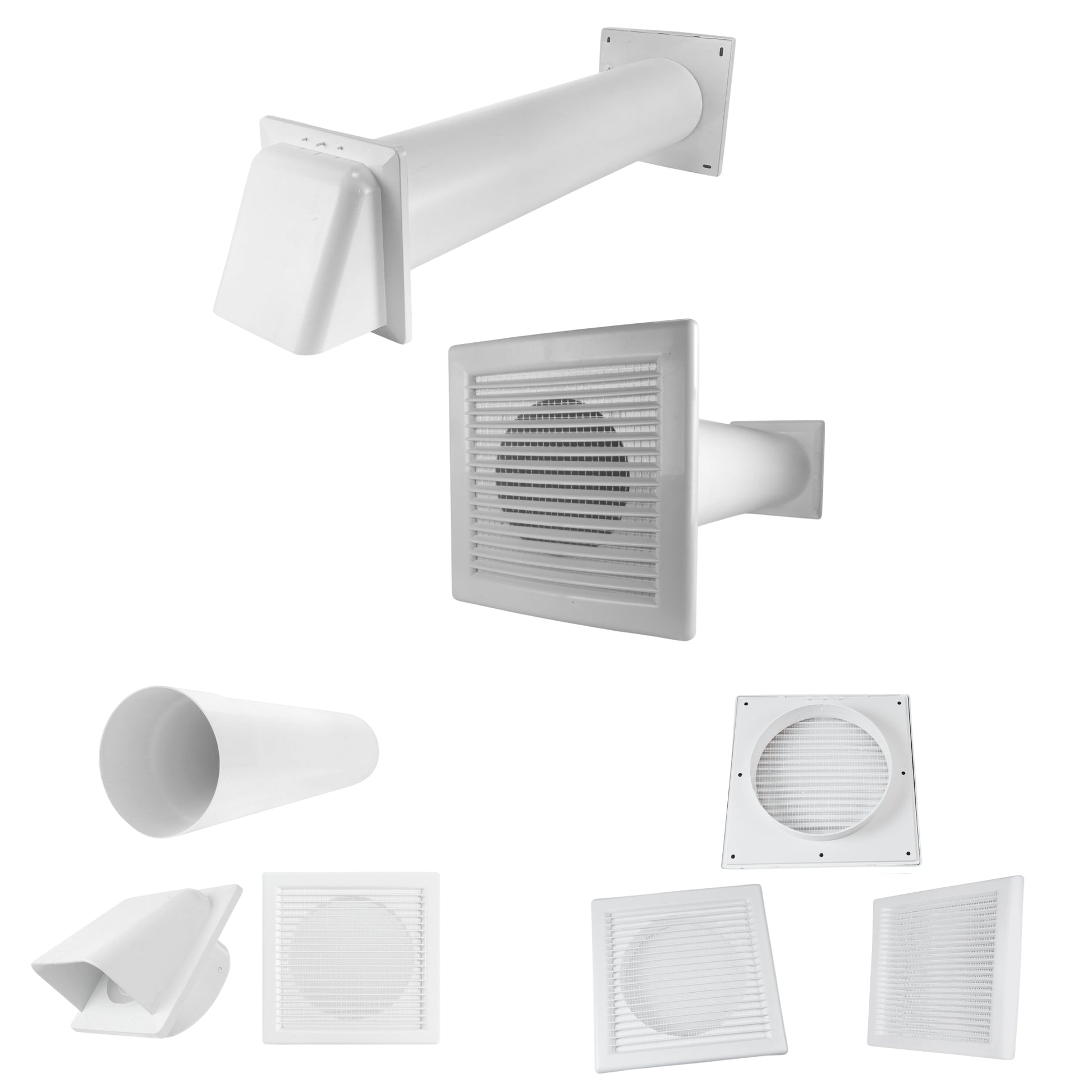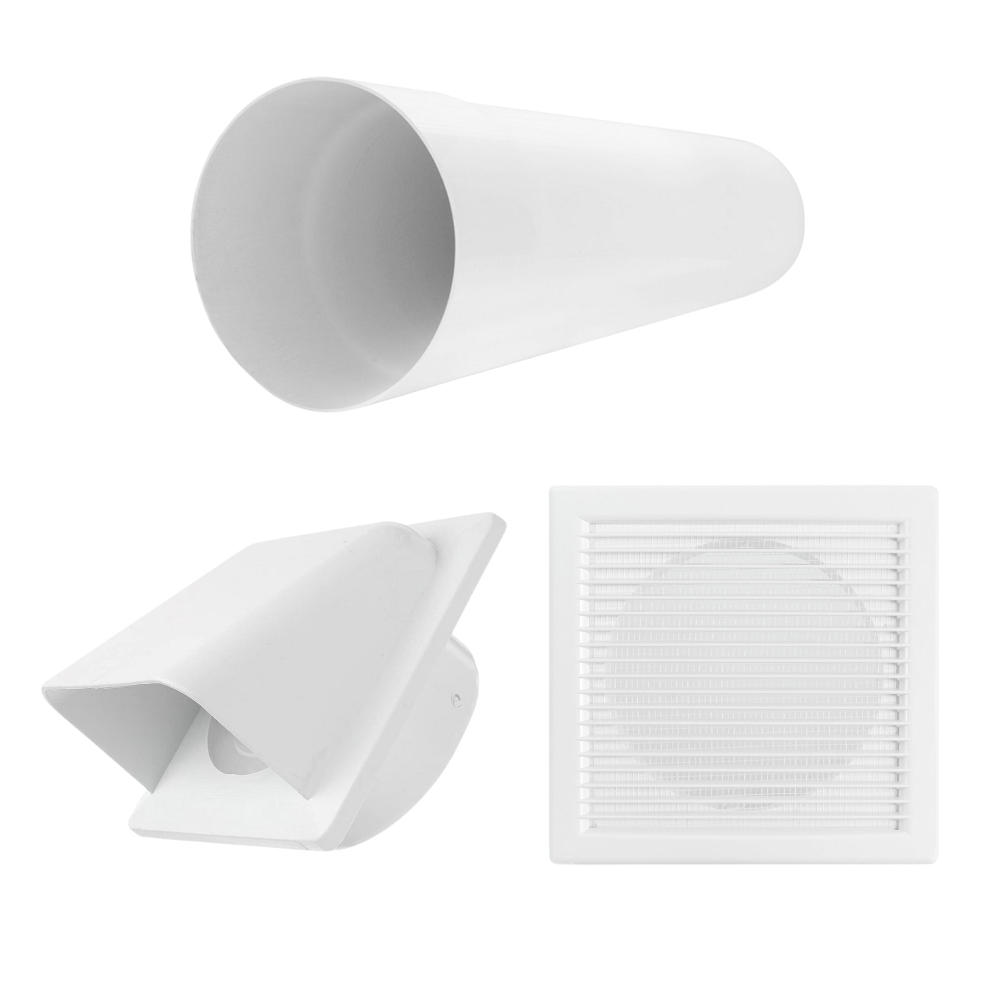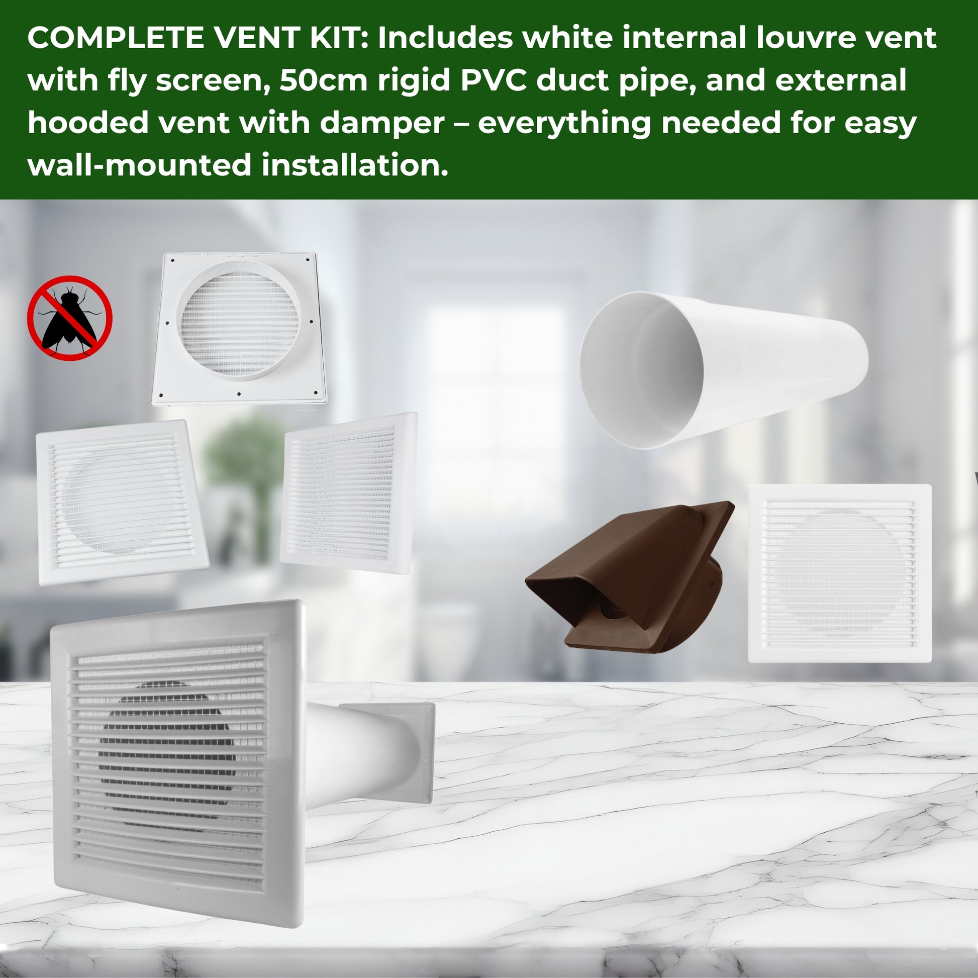 ★ COMPLETE VENT KIT: Includes white internal louvre vent with fly screen, 50cm rigid PVC duct pipe, and external hooded vent with damper – everything needed for easy wall-mounted installation.